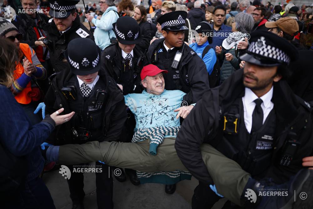 epaselect epa12882796 Police officers arrest a supporter of Palestine Action during a mass protest organised by the Defend Our Juries group at Trafalgar Square in London, Britain, 11 April 2026. A High Court judgement in February 2026 has ruled the UK government's ban of the group under the Terrorism Act was unlawful, but the Met Police said it has revised its enforcement approach and will resume arresting protesters for supporting the proscribed group until the government’s appeal had been considered. EPA/TOLGA AKMEN