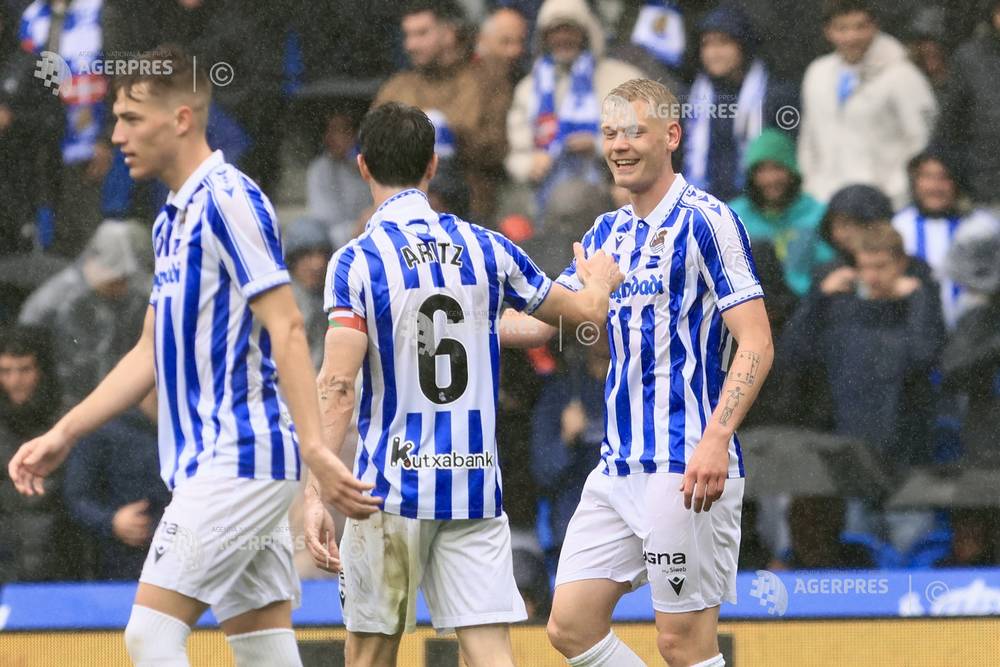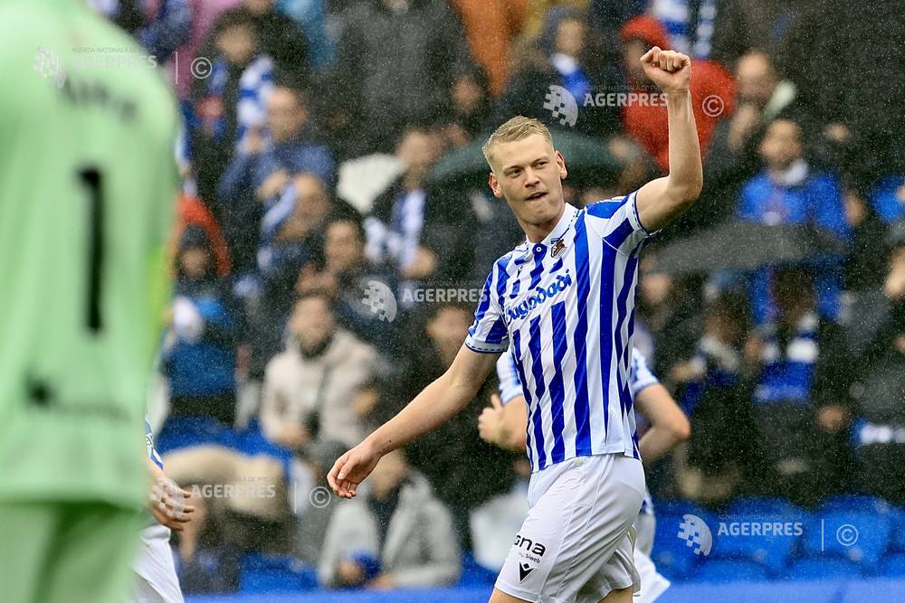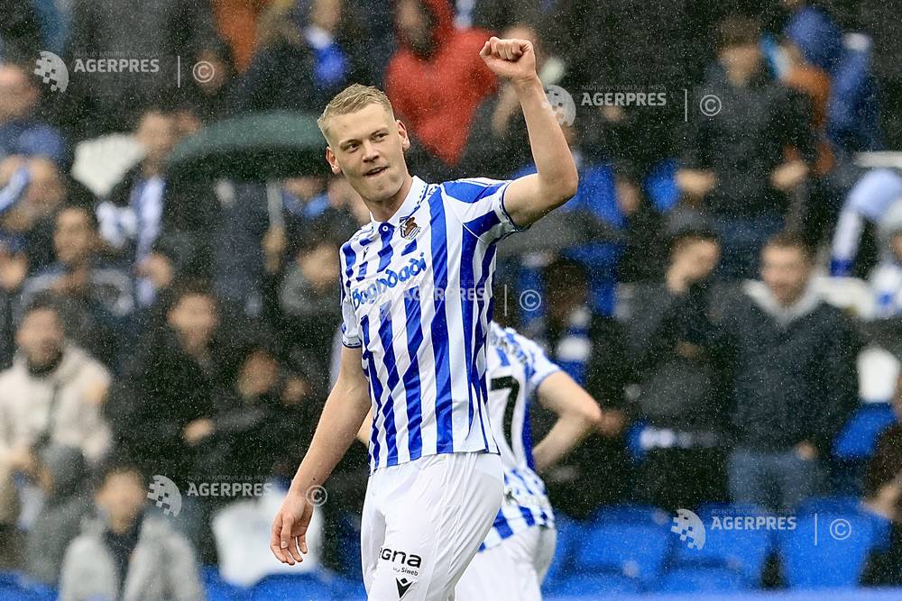 epa12882693 Real Sociedad's Orri Oskarsson celebrates after scoring against Alaves during the Spa...