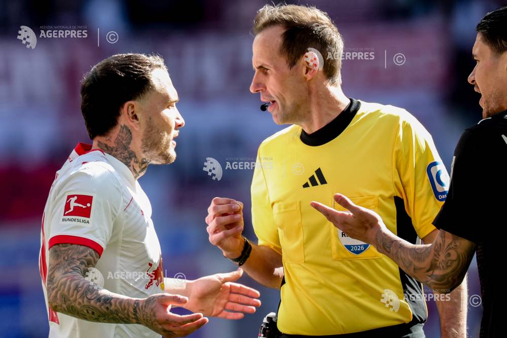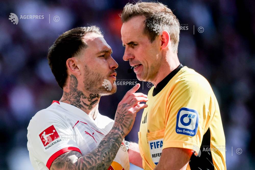 epa12882760 David Raum (L) of RB Leipzig argues with referee Sascha Stegemann during the German B...