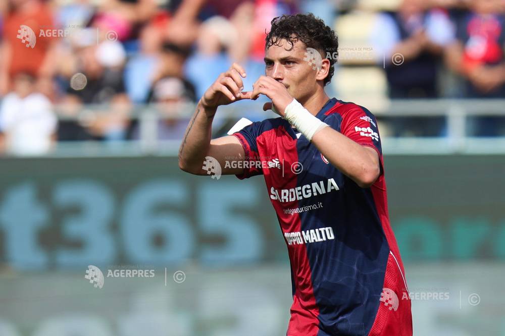 epa12882996 Cagliari’s Sebastiano Esposito poses after scoring the 1-0 opening goal during the Italian Serie A soccer match Cagliari Calcio vs US Cremonese, in Cagliari, Italy, 11 April 2026. EPA/FABIO MURRU